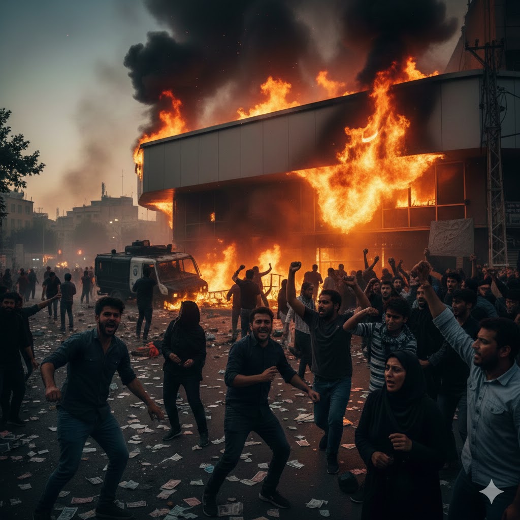 أدرك الإيرانيون أن طباعة النقود لإنقاذ “آينده” هي السبب المباشر وراء القفزة الجنونية في التضخم، الذي وصل لمستويات تاريخية (72% للمواد الغذائية). الريال الإيراني انهار بنسبة 84% أمام الدولار، مما جعل الرواتب الشهرية لا تكفي لشراء اللحم أو حتى الخبز بانتظام. عندها، لم يعد المتظاهرون يطالبون بإصلاحات سياسية فقط؛ بل بدأوا في حرق فروع البنوك، وعلى رأسها فروع “آينده”، التي أصبحت في نظرهم “مقابر لأموال الفقراء”.